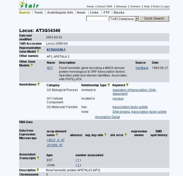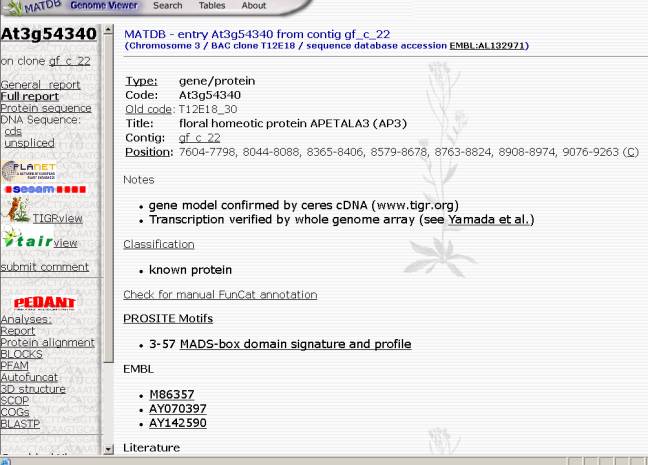from all AGI labs. The user can view various information about the gene searched
